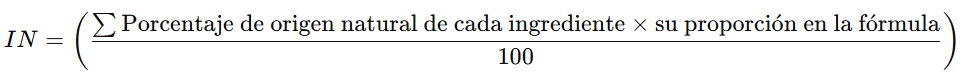 El Índice de Naturalidad (IN) de un ingrediente o fórmula se calcula con base en el porcentaje de componentes naturales y su grado de procesamiento. Una forma sencilla de estimarlo es con la siguiente fórmula: