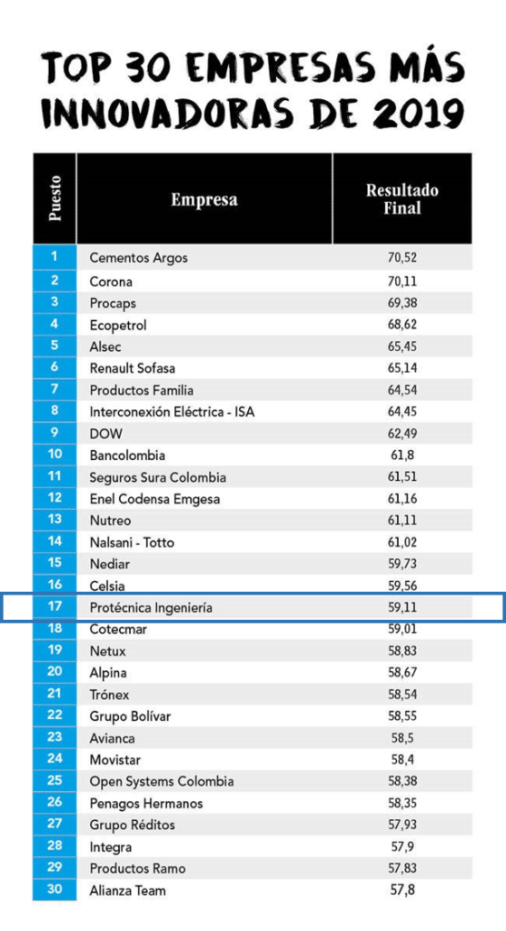 El 8 de Agosto la revista Dinero en su Edición 571, publico el Ranking de Innovación donde Protécnica Ingeniería se encuentra entre las primeras 30 compañías más innovadoras del país, ocupando el lugar N°17.